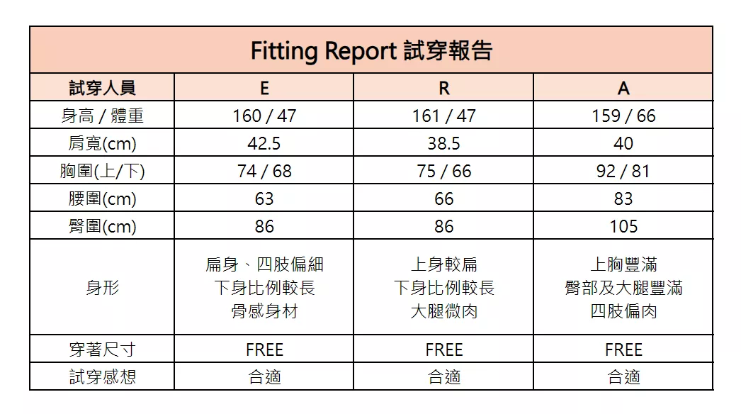 實穿人員(深灰色): E 編,Size FREE試穿報告請參考以下