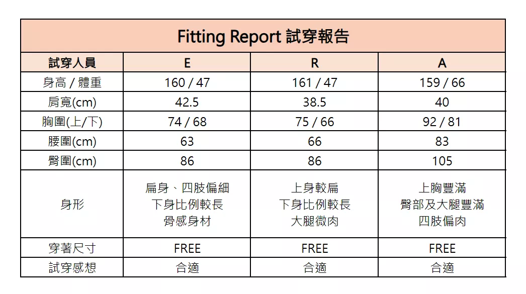 實穿人員(杏色): A 編,Size FREE試穿報告請參考以下