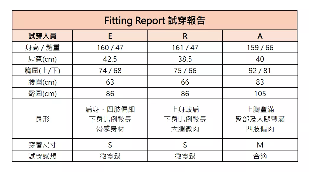 實穿人員(卡其色): A 編,Size M / R 編,Size S
